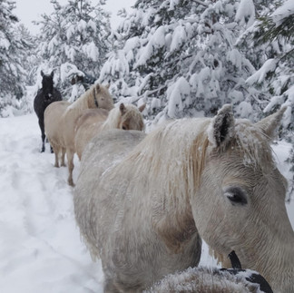 Korralik talv on lõpuks saabunud! Et hobusteni pääseda, on vaja läbida põlvest poole reieni lumine tee. Koplite alumist karjust pole üldse näha, ülemine oli kohati alla põlve kõrge, sest rasked männioksad on oma töö teinud. Kuna elektrit juba eilsest õhtust pole, siis nad vist ainult viisakusest on veel omas koplis Õnneks nad olid abiks ning käisime koos kõik aiad ja lumised oksad üle. Miniponi jäi lumme samasse kohta 5-minutiks kinni, kuhu mina vahetult enne puusani sisse vajusin